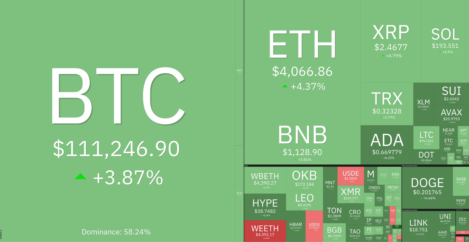 Биткойн (BTC) снова поднялся выше $111 000 в начале европейской торговой сессии в понедельник, поскольку улучшение макроэкономической ситуации вызвало новую уверенность инвесторов.