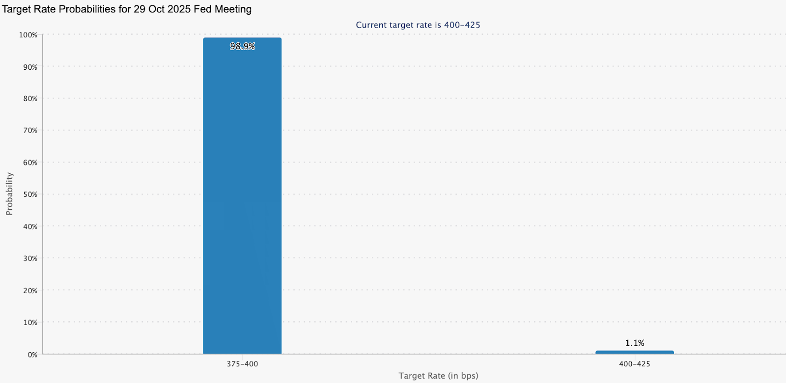 Между тем, участники рынка учитывают 99% вероятность снижения ставки на 0,25 процентного пункта на заседании Комитета по открытым рынкам ФРС (FOMC) 28-29 октября, что приведет к снижению ставок до 3,75%-4%.