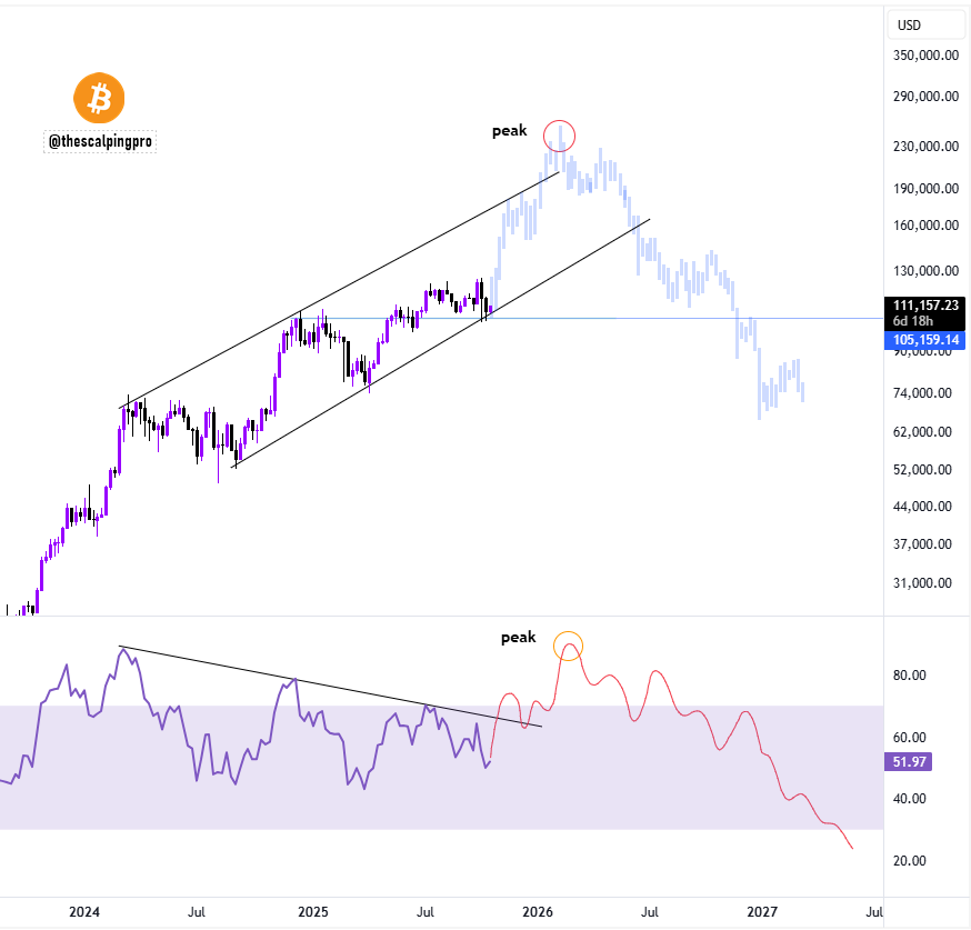 Аналогичный, хотя и более оптимистичный прогноз поделился аналитик Mags, который сказал, что биткойн может продолжать расти в восходящем канале на недельном графике, достигая области $250,000-$290,000.