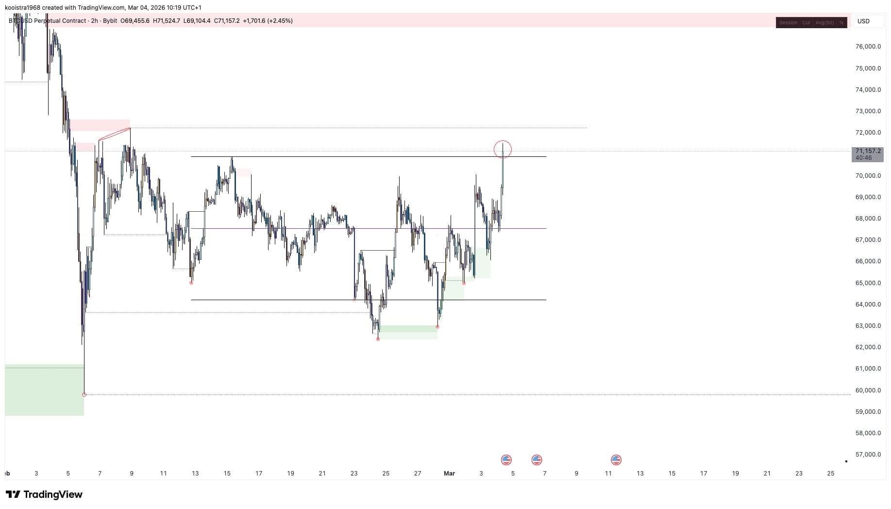 - Движение цены намекает на возможный новый прорыв после того, как с января BTC не удавалось закрепиться выше $70 000.