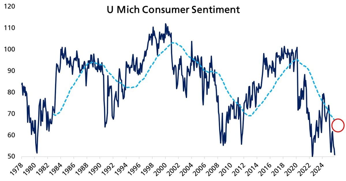 Экономист Тимоти Питерсон также обратил внимание, что потребительские настроения приближаются к рекордно низким значениям, а пятилетнее среднее находится на историческом минимуме. По его словам, в такой среде люди обычно не покупают биткоин и другие рисковые активы, и «ростового цикла не будет, пока ситуация не развернется».