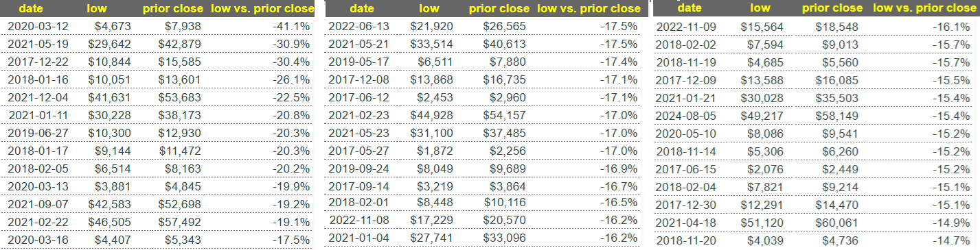 Даже без учета "краха COVID" — впечатляющего внутридневного падения на 41,1% 12 марта 2020 года — когда ведущая биржа деривативов на биткоин, BitMEX, столкнулась с проблемами ликвидности и коротким сбоем на 15 минут, существуют еще 48 дней, когда биткоин переживал даже более глубокие коррекции.