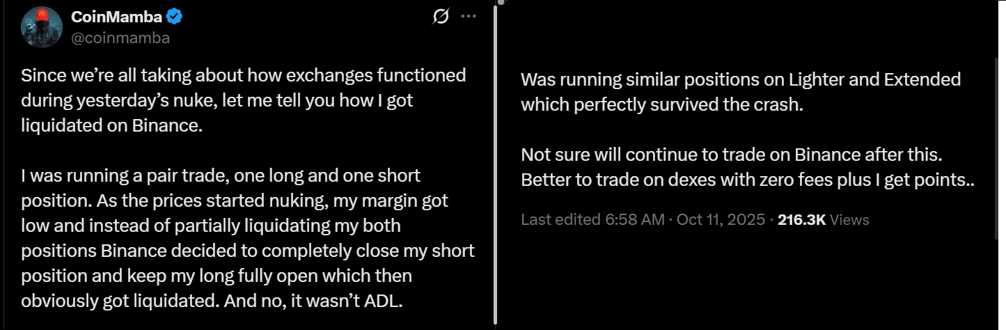 Hyperliquid, постоянная децентрализованная биржа, сообщил о принудительном закрытии позиций на $2,6 миллиарда. В то же время трейдеры на нескольких платформах, включая Binance, сообщили о проблемах с расчетами портфельного маржинального обеспечения. Пользователи DEX жаловались на автоматическое снижение долга, которое происходит, когда контрагенты не выполняют маржинальные требования.
