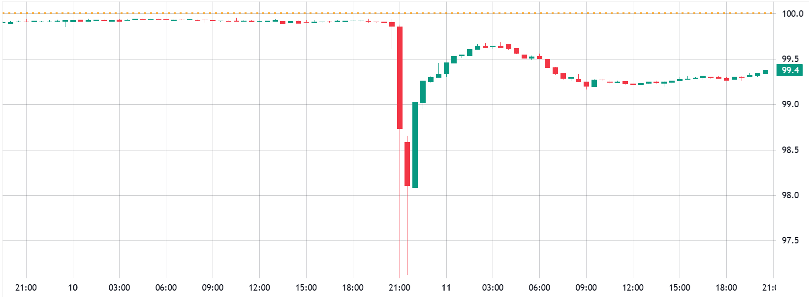 Хотя пятничное падение явно стало сбоем, его также можно объяснить низкой ликвидностью в выходные, особенно поскольку рынки облигаций США были закрыты в понедельник из-за национального праздника. Другими возможными факторами являются слухи о неплатежеспособности, которые могли побудить маркет-мейкеров воздержаться от дополнительных рисков.