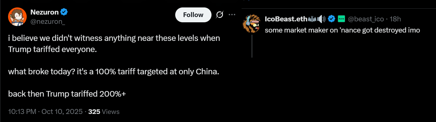 По сути, даже трейдеры с значительными прибылями увидели, как некоторые позиции были в одностороннем порядке прекращены, создавая серьезные проблемы для тех, кто использует портфельное управление вместо изолированного управления рисками. Эта ситуация не обязательно вина бирж или свидетельство неправомерных действий; это следствие использования кредитного плеча на относительно мало ликвидных рынках. Некоторые альткоины упали на 40% и более, что привело к обвалу залоговых депозитов трейдеров.