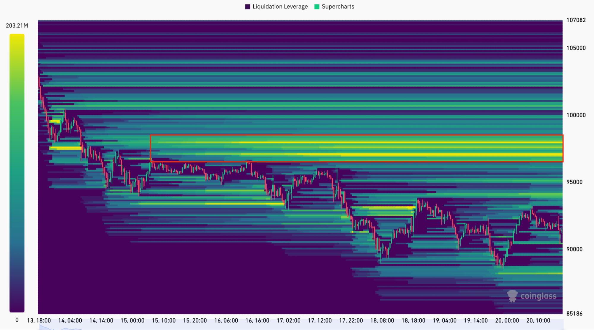 Несколько трейдеров ищут ликвидность около $98,000, и последние данные с ресурса для мониторинга рынка CoinGlass показали, что цена уходит от ликвидности около $92,000. Более $2.1 миллиарда заявок на покупку расположены между $96,600 и $98,500.