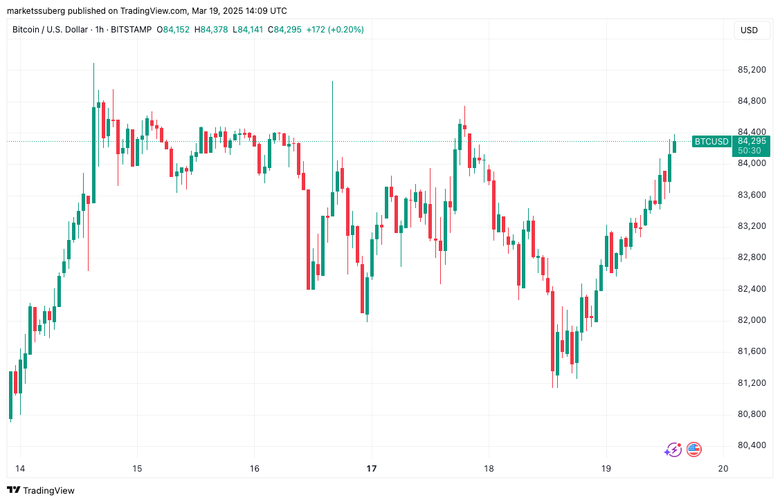 Биткоин (BTC) превысил отметку в 84 000 долларов 19 марта, в то время как рынки ожидают решения Федеральной резервной системы США по процентной ставке.