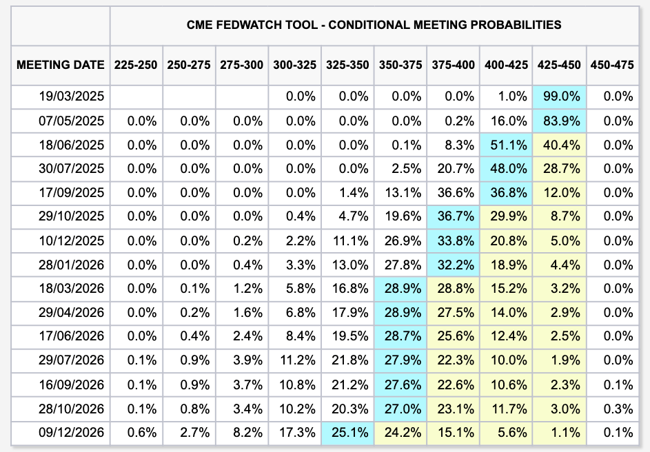 Вероятности изменения целевой ставки ФРС (скриншот). Источник: CME Group
