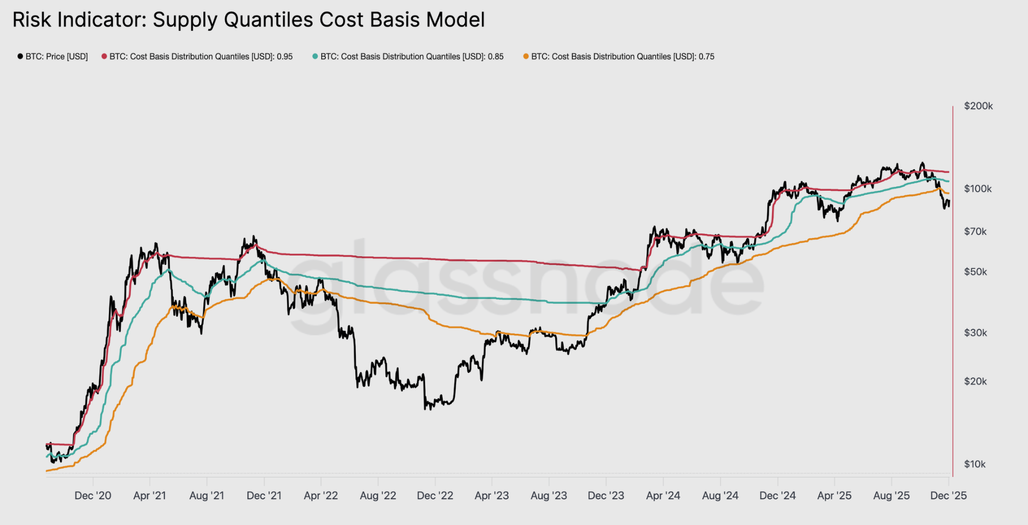 Сходство подтверждается моделью стоимости по квантилям поставок, которая отслеживает цену входа для крупнейших кластеров монет. С середины ноября цена Биткоина опустилась ниже 0.75 квантиля, сейчас торгуясь около $96,100, что означает, что более 25% поставок находятся в убытке.