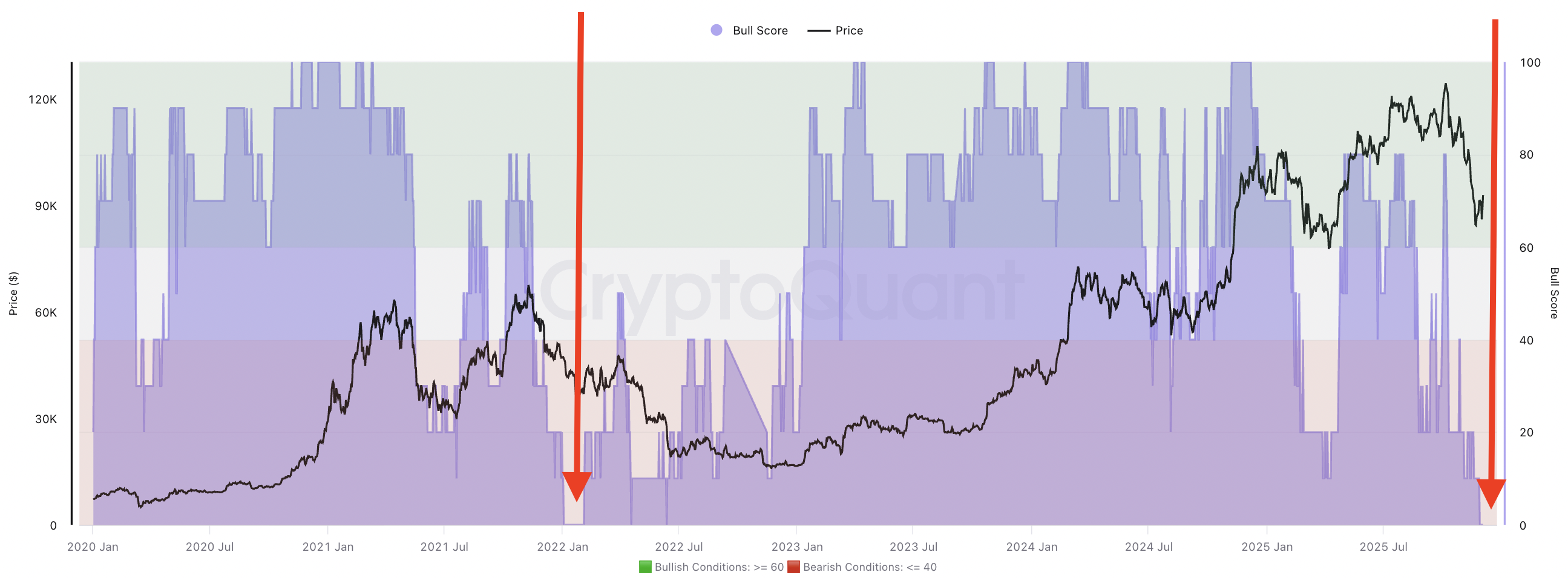 Индекс Bull Score от CryptoQuant предлагает более детальный обзор после резкого падения с августа и снижения ниже 40 в октябре. Значение индекса оставалось на низком уровне на протяжении всего ноября, несмотря на кратковременную волатильность цены.