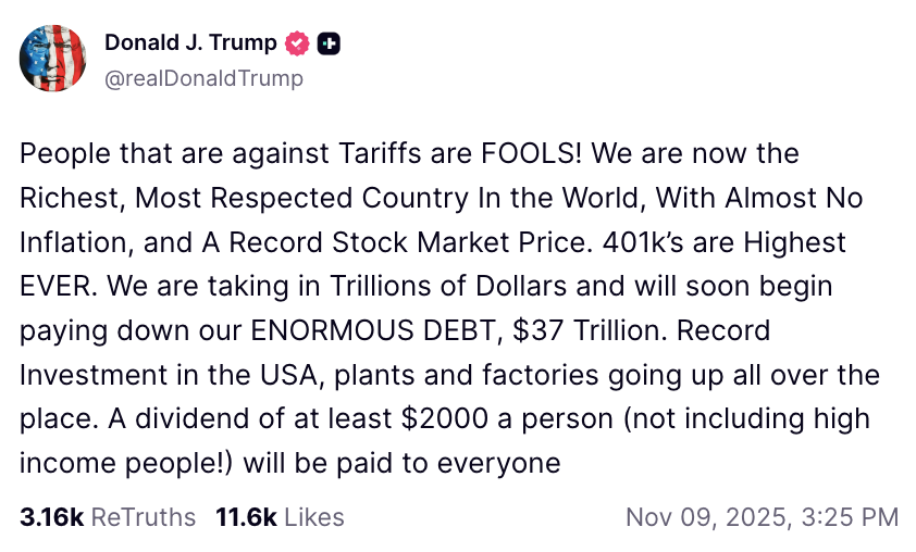 “Дивиденд в размере как минимум $2000 на человека (за исключением лиц с высоким доходом!) будет выплачен всем,” говорится в сообщении.