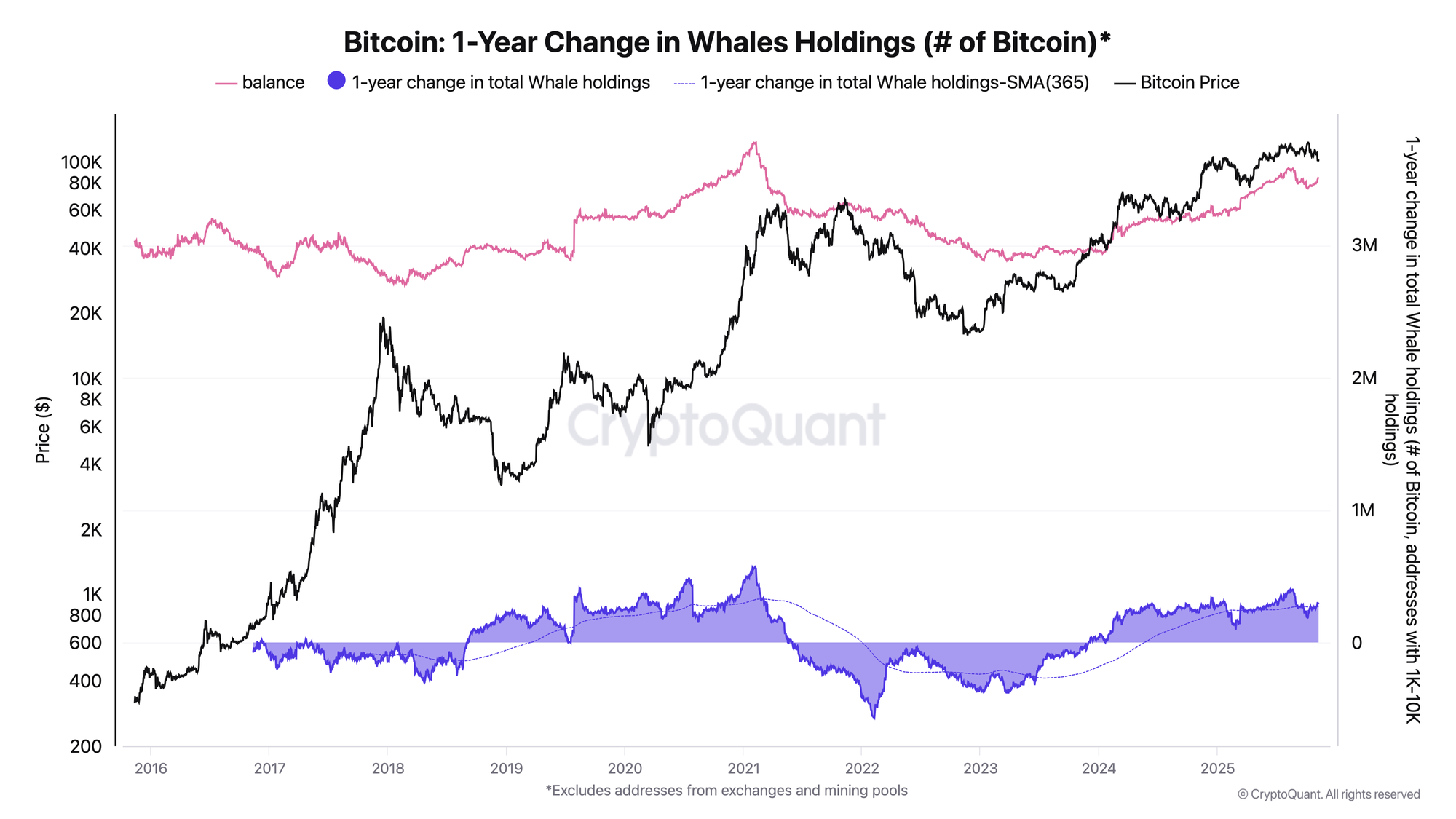 Сопроводительный график подтверждает, что за последние два года однолетнее изменение в холдингах китов остаётся положительным.