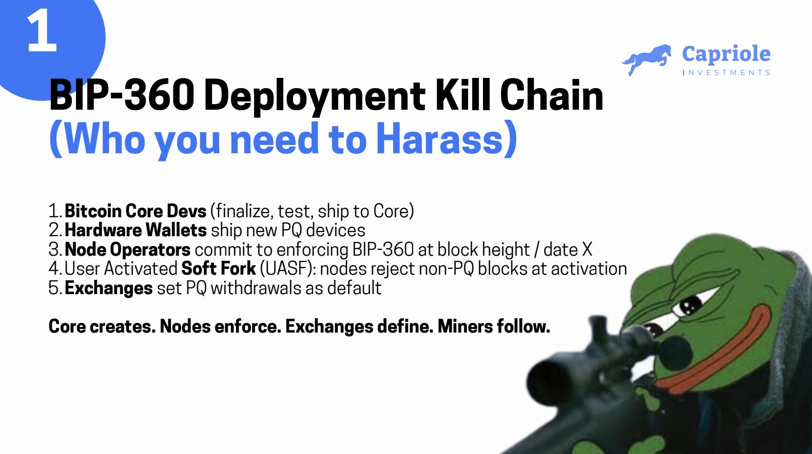 Однако внедрение нового стандарта потребует более широкого консенсуса среди производителей аппаратных кошельков, операторов узлов и криптовалютных бирж, добавил Capriole в четверг в посте на X. Примерно «20-30% биткоина будут захвачены квантовыми хакерами в ближайшие годы», сказал Эдвардс. «Я считаю, что мы должны сжечь все монеты, которые не перейдут на BIP-360 к 2028 году.»