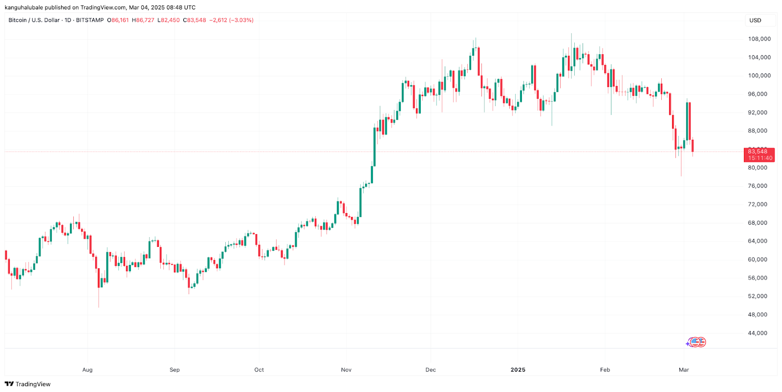 Данные из dc.finance Markets Pro и TradingView показывают, что цена на биткоин резко упала с максимальных $94,422 3-го марта до внутридневного минимума $82,450 4-го марта.
