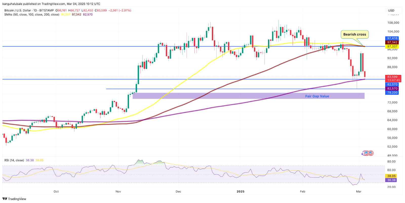 - Цена биткоина упала до $82,450 на Bitstamp, уничтожив все достижения между 1 и 2 марта.