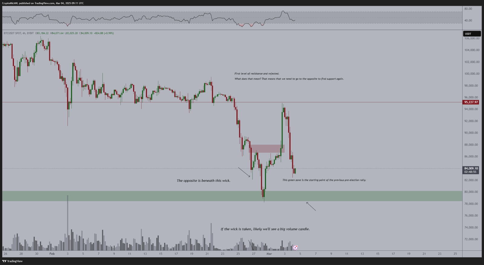 По мнению ван де Поппе, падение ниже минимума 28 февраля $78,200 приведет к крупной объемной свече, которая направит цену биткоина к середине $70,000.