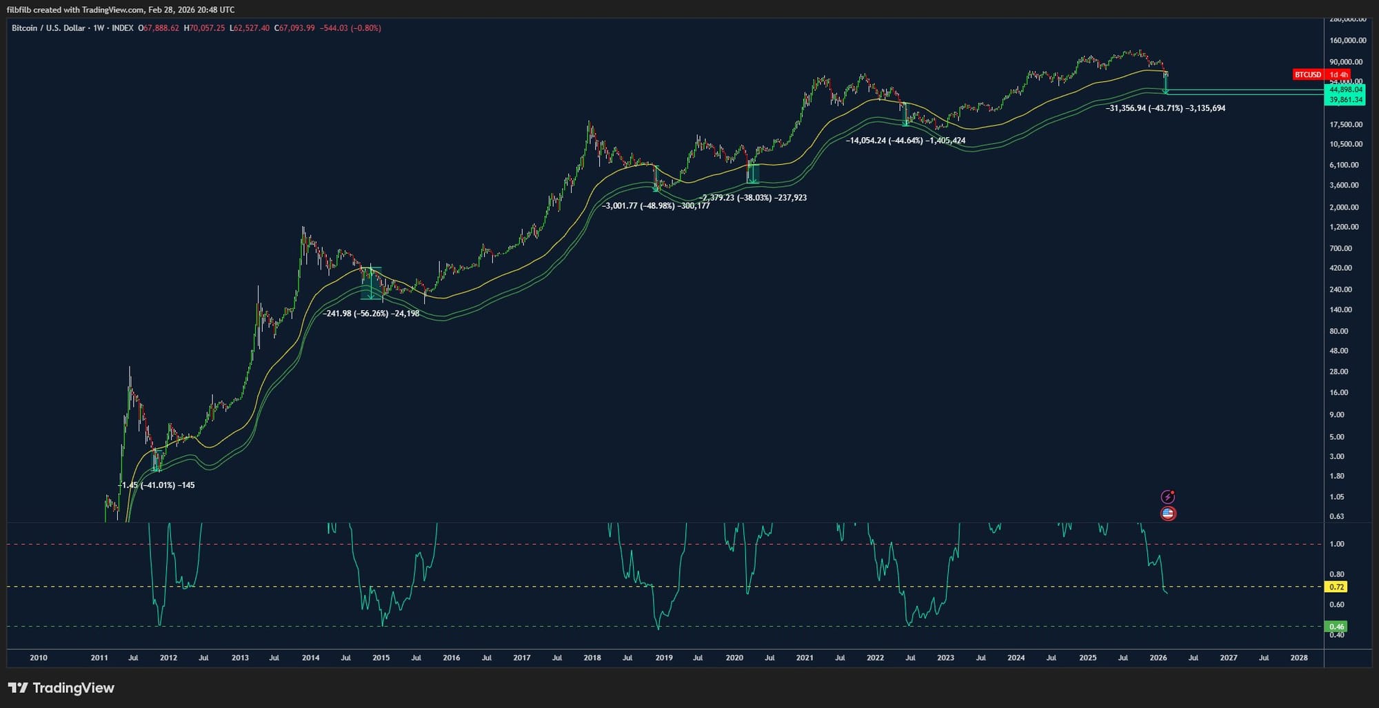 Негативные прогнозы по BTC на больших таймфреймах сохраняются: быкам не хватает импульса, чтобы вернуть даже ближайшие уровни поддержки. Аналитик Filbfilb обратил внимание на историческую закономерность: недельное закрытие ниже определённой зоны в прошлом часто приводило к коррекции на 40–50%.