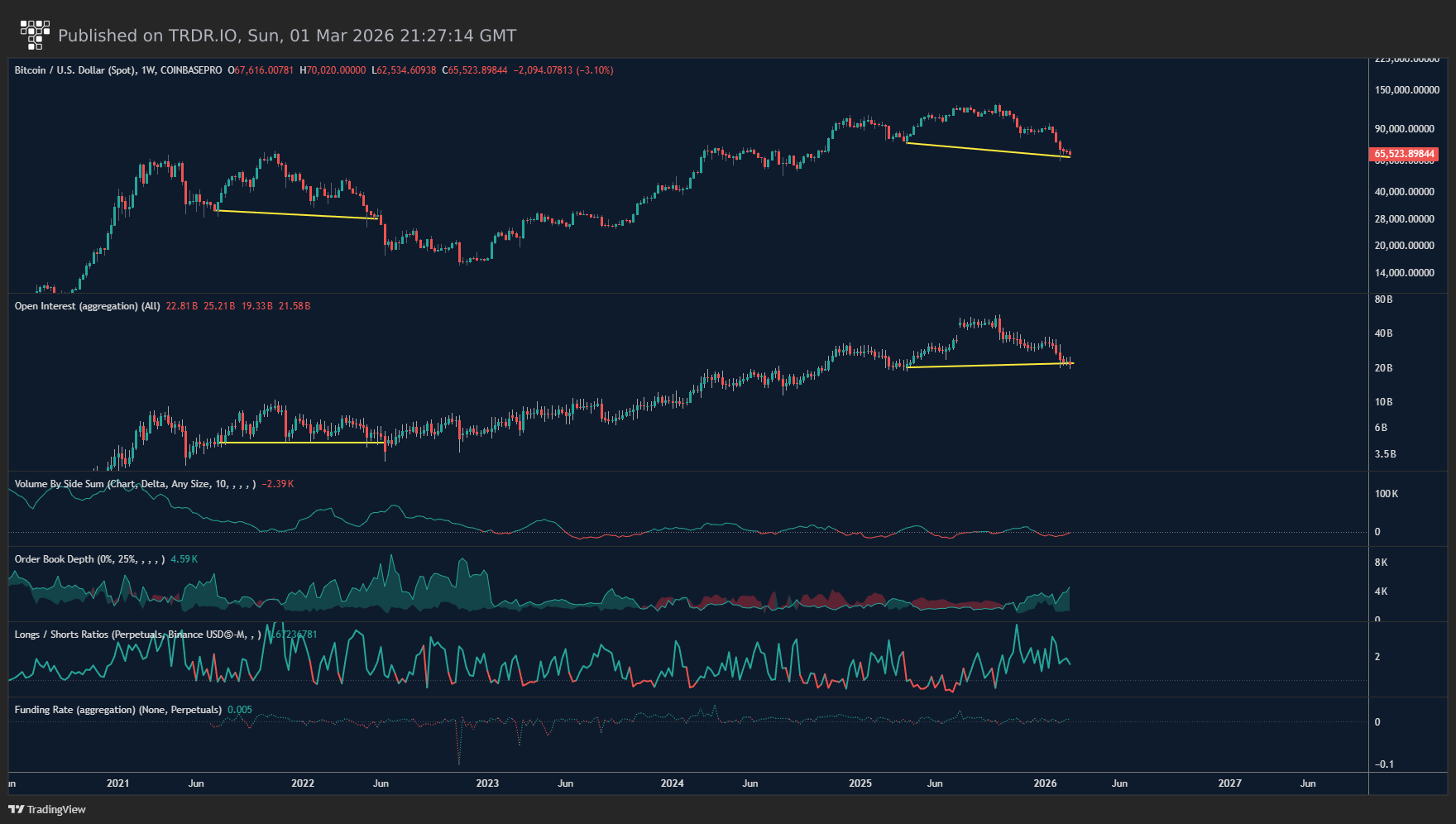 Также отмечается, что динамика открытого интереса напоминает поведение рынка в прошлом медвежьем цикле: открытый интерес растёт на фоне снижения цены, что может указывать на усиление коротких позиций.