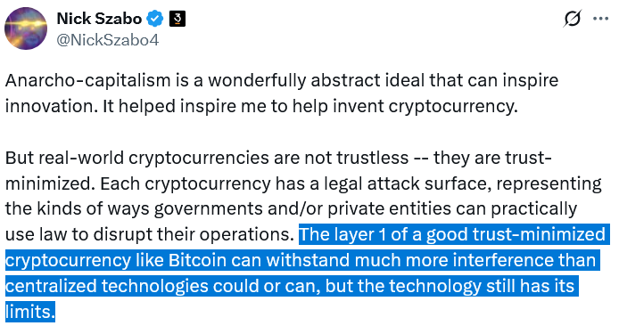В своем недавнем посте на X, Сабо пояснил, что у каждой криптовалюты и сети первого уровня есть юридическая уязвимость, которая позволяет им быть нарушенными со стороны правительств.
