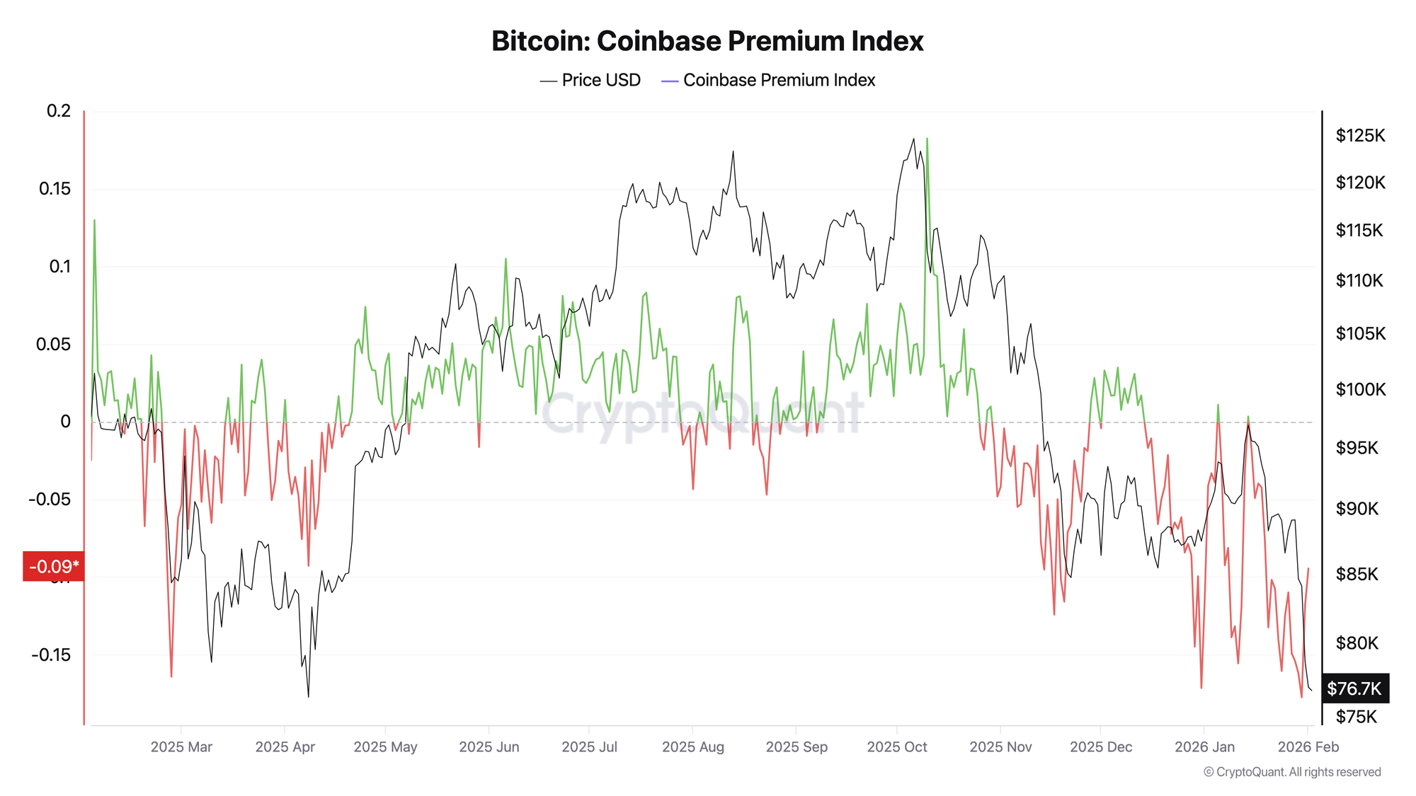 Отрицательная премия может означать, что спрос в Азии опережает спрос в США, а торговые часы Уолл-стрит становятся периодом давления на цену BTC. По данным CryptoQuant, премия остается отрицательной с середины декабря и 30 января опускалась до -0,177 — минимума более чем за год.