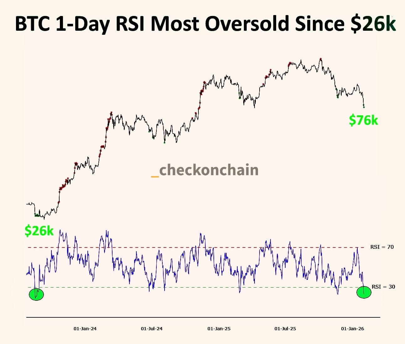 На недельном таймфрейме RSI по BTC приближается к важному уровню: сейчас он около 32,2 — примерно на два пункта выше зоны перепроданности.