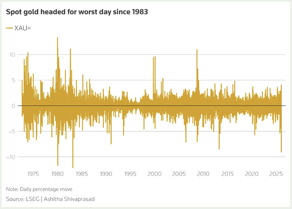 «После новостей о выдвижении Уорша золото упало почти на 10%, а серебро — более чем на 30%. Это были худшие однодневные падения с начала 1980-х».