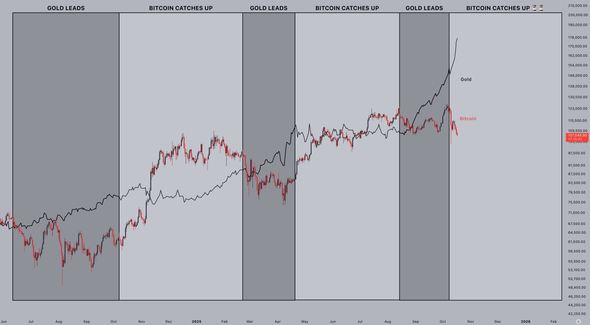 «В любом случае, логично ожидать, что скоро прибыль оттечет из золота с учетом поведения рынка,» — отметил криптотрейдер Жель в X.