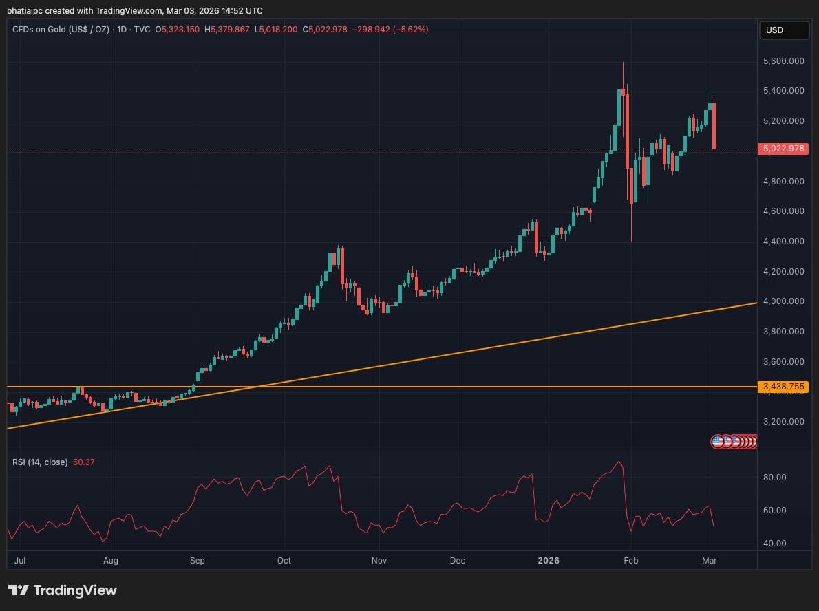 После открытия торгов в США индексы S&P 500 и Nasdaq Composite теряли около 2%, а золото также пошло вниз, приближаясь к поддержке в районе $5 000.
