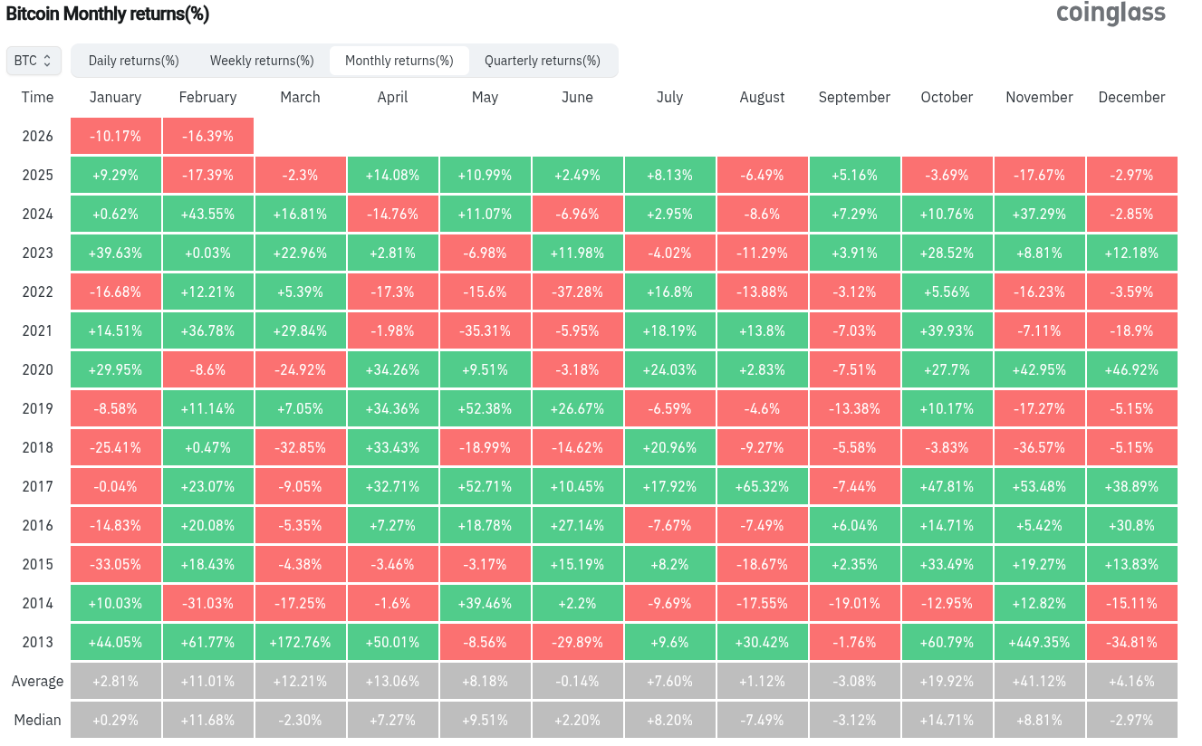 На момент публикации динамика BTC/USD за месяц была сопоставима с февралем 2025 года: потери приближались к 17% с начала месяца.