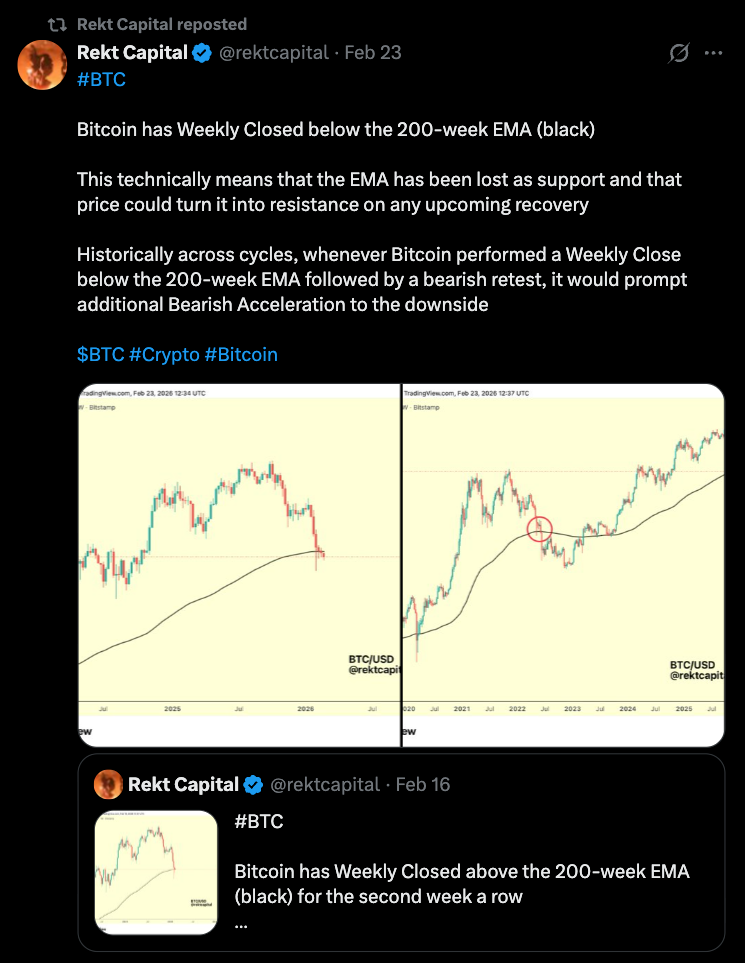 Также BTC находится примерно в 9% от своей 200-недельной экспоненциальной скользящей средней (около $58 855) — уровня, который некоторые трейдеры в прошлых циклах рассматривали как начало процесса формирования дна. При этом аналитик Rekt Capital настроен менее оптимистично.