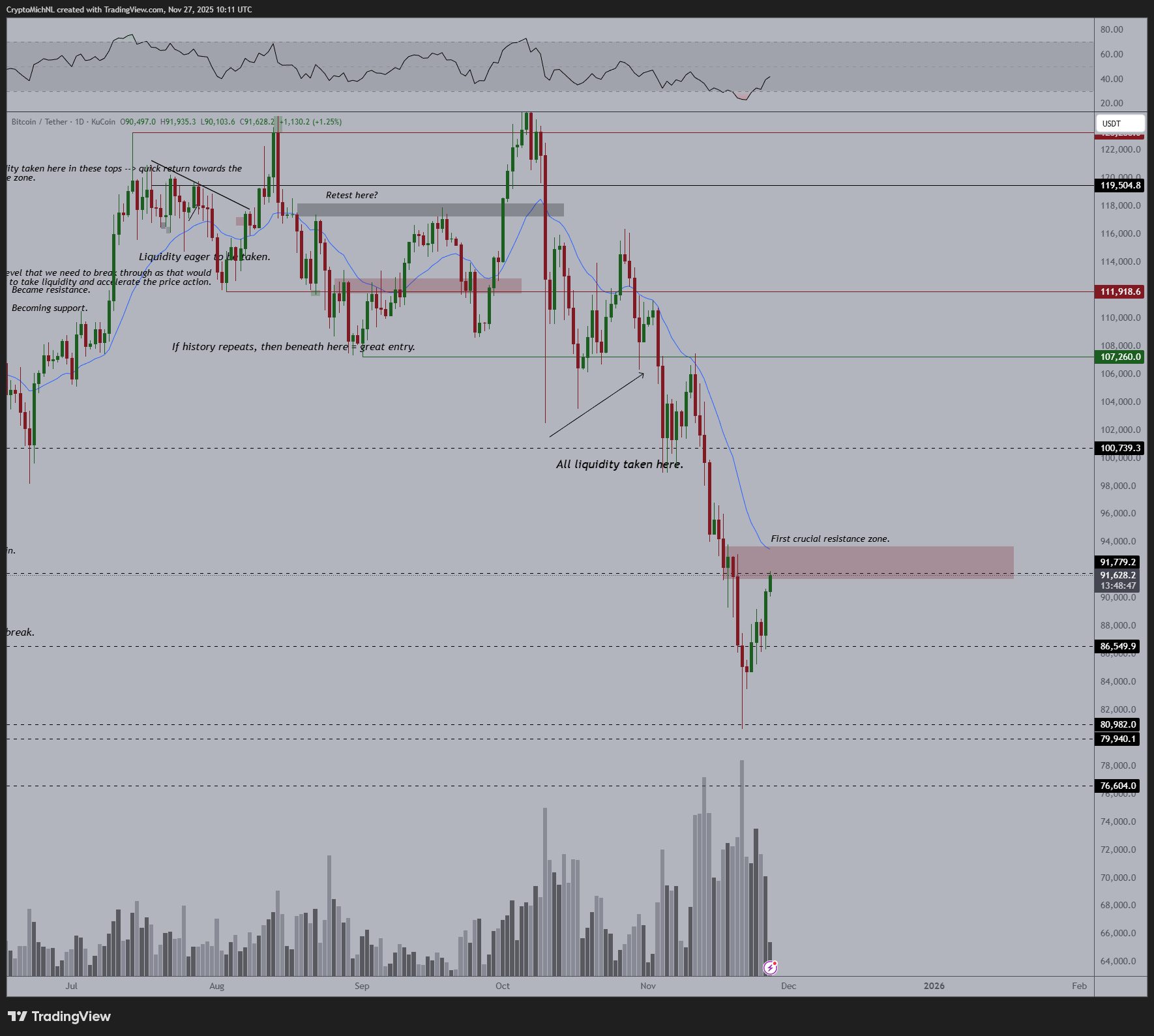 - Биткоин удерживает уровень поддержки в 90 000 долларов на фоне выходных в честь Дня благодарения после достижения недельных максимумов.