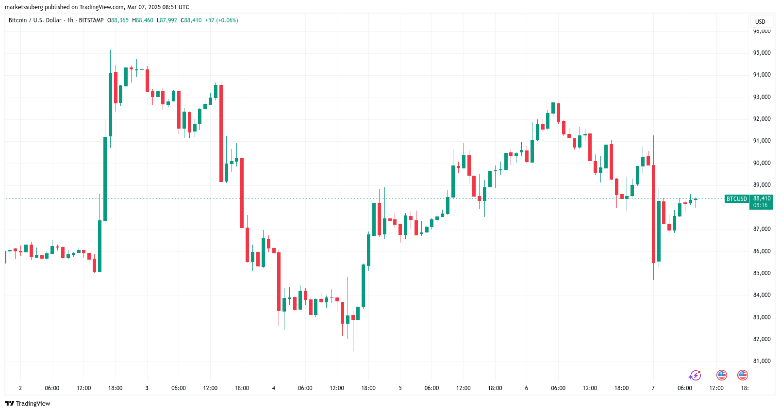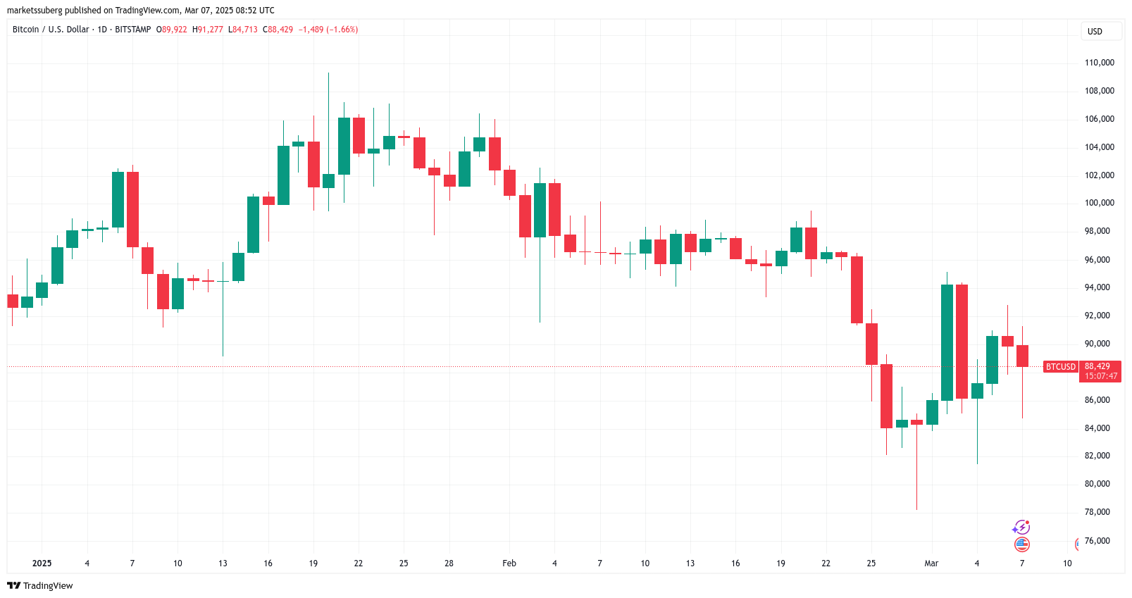 Биткоин (BTC) подорожал на 4% 7 марта, когда рынки переварили недовольство по поводу Стратегического Резерва США в биткоинах.