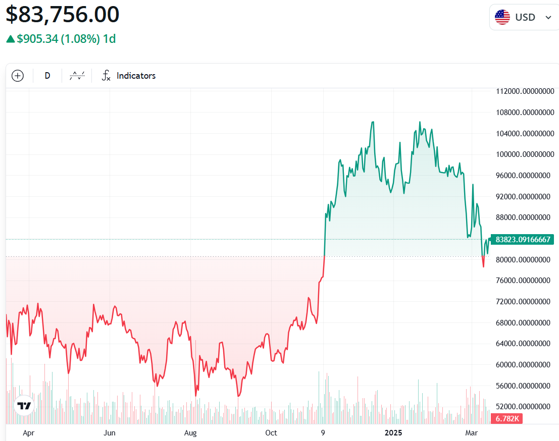 Цена Биткоина (BTC) упала более чем на 3% за последнюю неделю и торгуется выше $83 748 на 9:33 утра по универсальному координатному времени, по данным dc.finance Markets Pro.