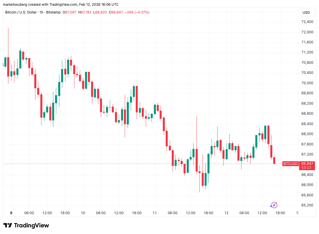 Данные TradingView показывают, что второй день подряд ценовое движение BTC сосредоточено в районе $67 000.