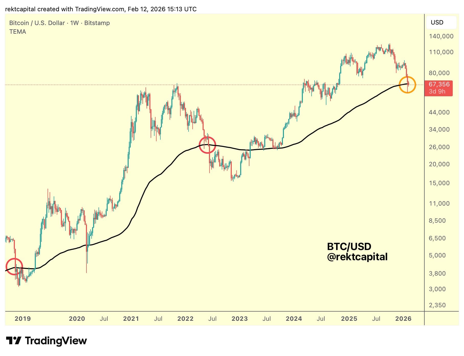 «200-недельная EMA соответствует уровню примерно $68 300. Поэтому недельное закрытие ниже ~$68 300, а затем медвежий ретест этого уровня, вероятно, создаст условия для повторения истории и дальнейшего снижения со временем».