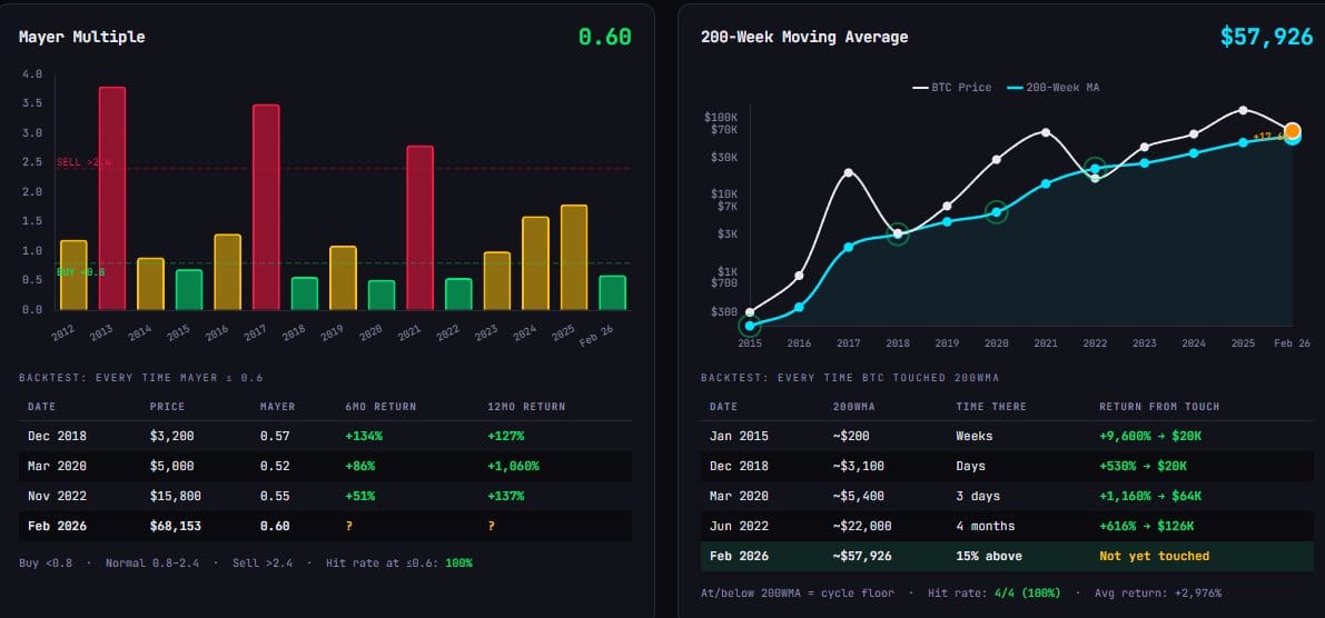Он отметил, что за всю историю Bitcoin два индикатора неоднократно показывали лучшие сигналы рыночного дна: Mayer Multiple (отклонение от 200-дневной средней) и 200-недельная скользящая средняя.