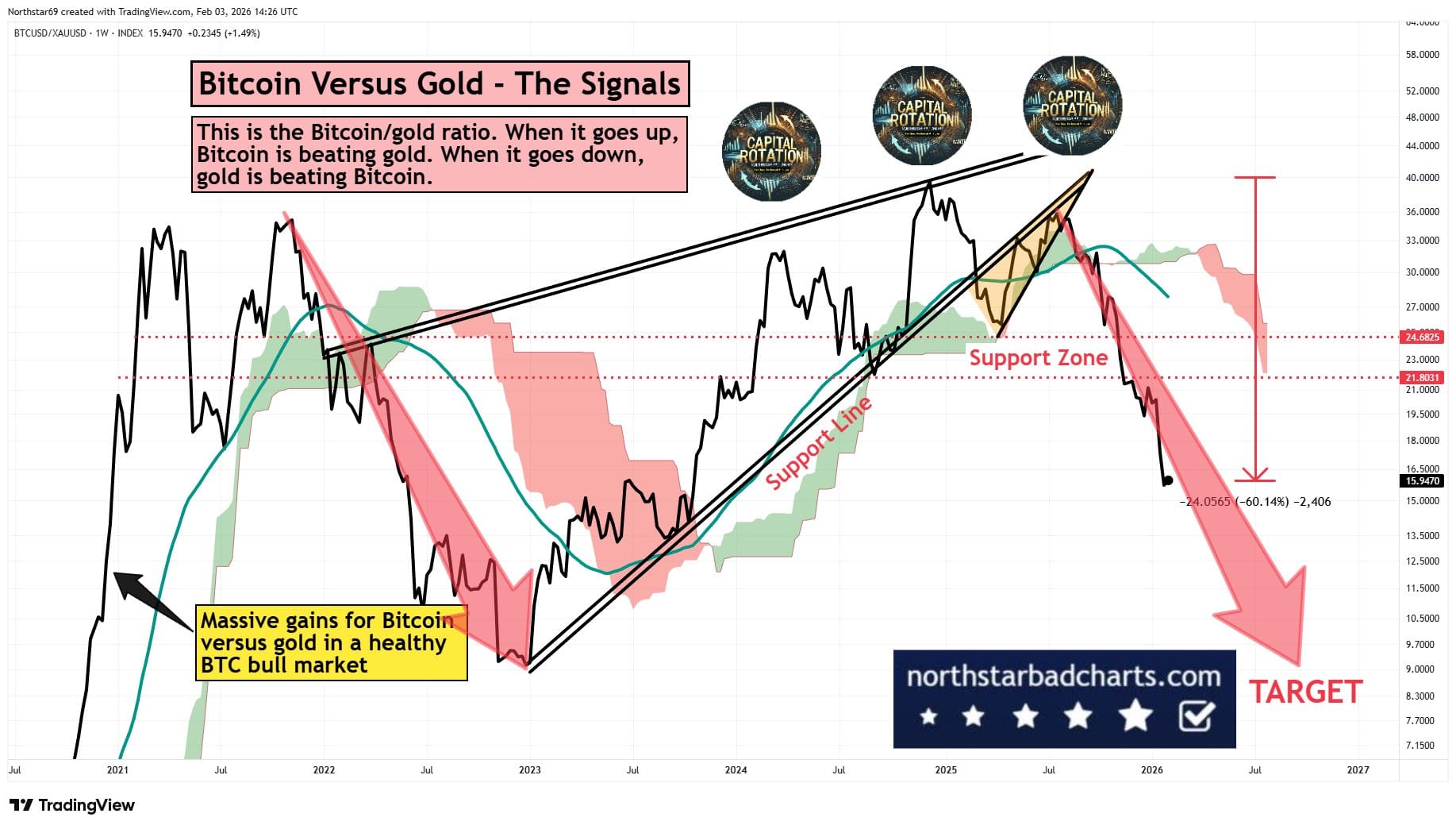 Другие настроены куда более скептично. Трейдер и аналитик Northstar считает, что в пересчете на золото биткоин со временем может потерять до 80% стоимости, указывая на возможную ротацию капитала и отсутствие новых существенных максимумов BTC относительно золота в текущем цикле.