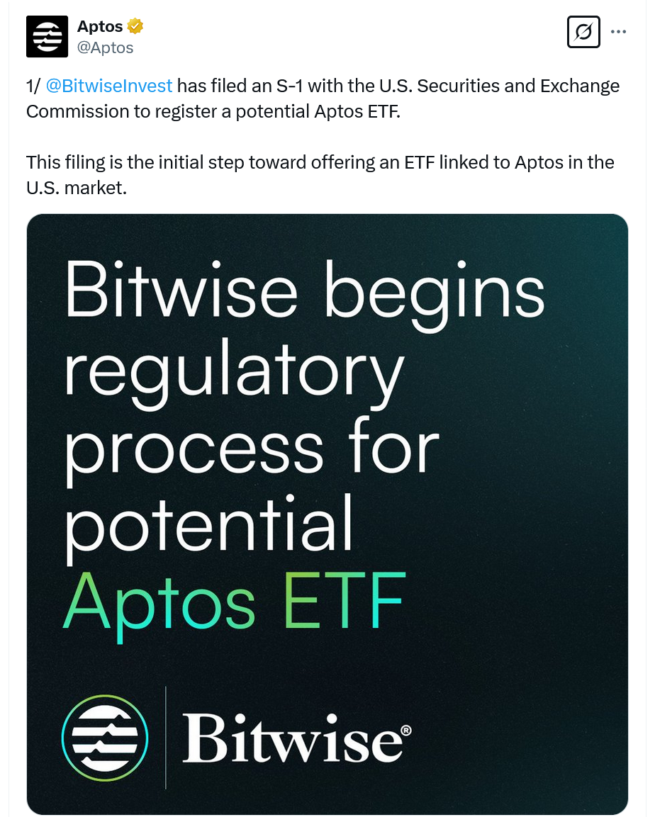 Bitwise подала заявление на регистрацию S-1 для листинга Bitwise Aptos (APT) ETF 5 марта, через восемь дней после того, как компания указала на намерение подать такую заявку, зарегистрировав траст, связанный с Aptos ETF, в Делавэре 28 февраля.
