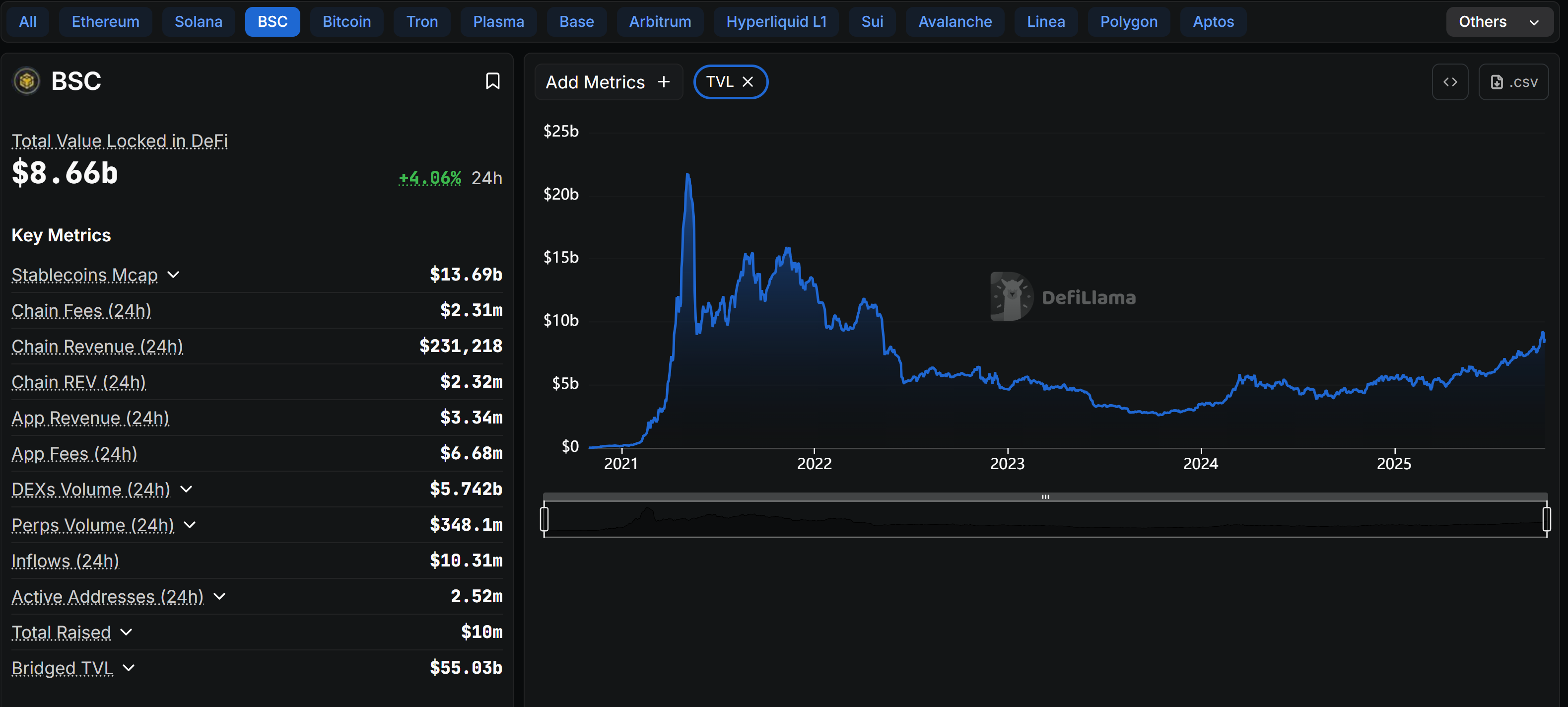 Согласно данным DefiLlama, совокупная стоимость заблокированных средств (TVL) в BNB Smart Chain составляет 8,66 миллиардов долларов, что делает ее третьей по величине блокчейн-сетью. За последний день сеть обслужила 2,52 миллиона активных пользователей и произвела более 20,7 миллиона транзакций.