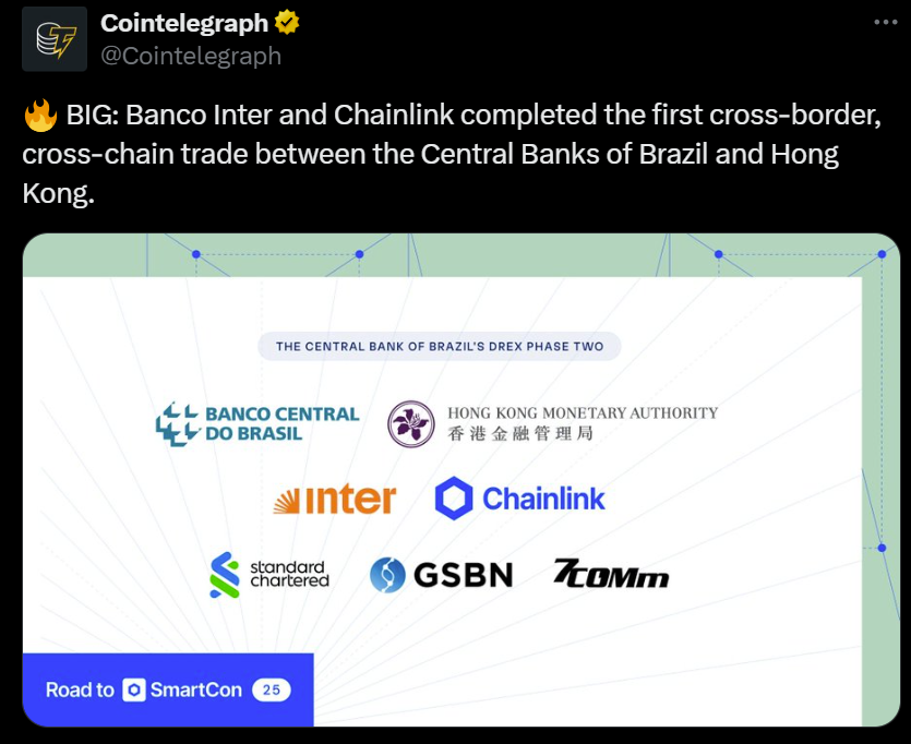 Бразильский цифровой банк Banco Inter завершил пилотный проект по финансированию международной торговли, основанный на блокчейне, с участием Chainlink, Центрального банка Бразилии и Валютного управления Гонконга (HKMA), демонстрируя, как технология распределенного реестра может упростить международные расчеты.