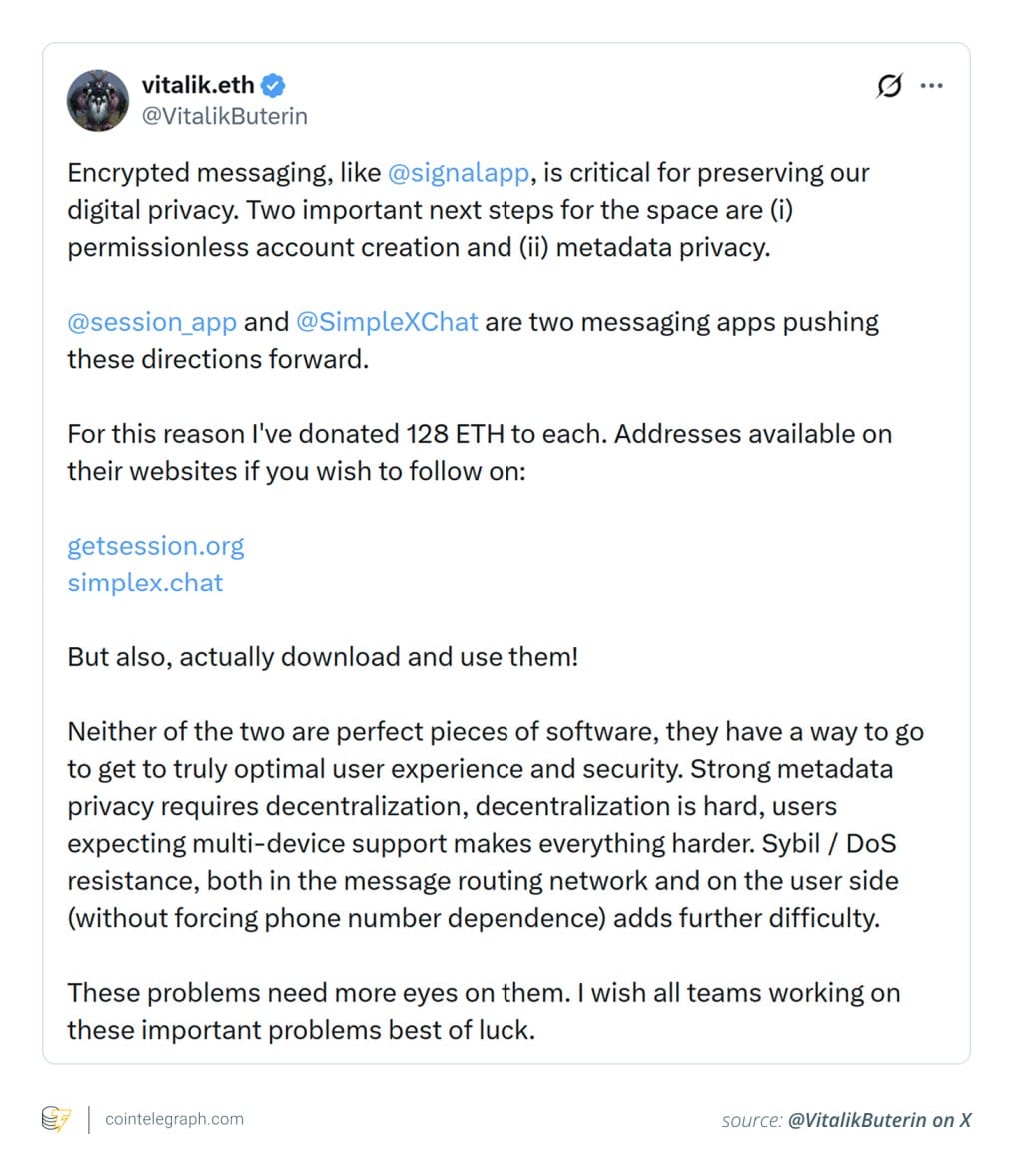 Это то, на что Виталик Бутерин обратил внимание в своем недавнем посте и пожертвовании. Он утверждает, что следующий шаг для безопасных сообщений — это создание учетных записей без необходимости в номерах телефонов или идентификации пользователя и значительно более сильная защита метаданных. В этом контексте он выделил Session и SimpleX и отправил 128 эфиров (ETH) каждому проекту для дальнейшего развития в этом направлении.