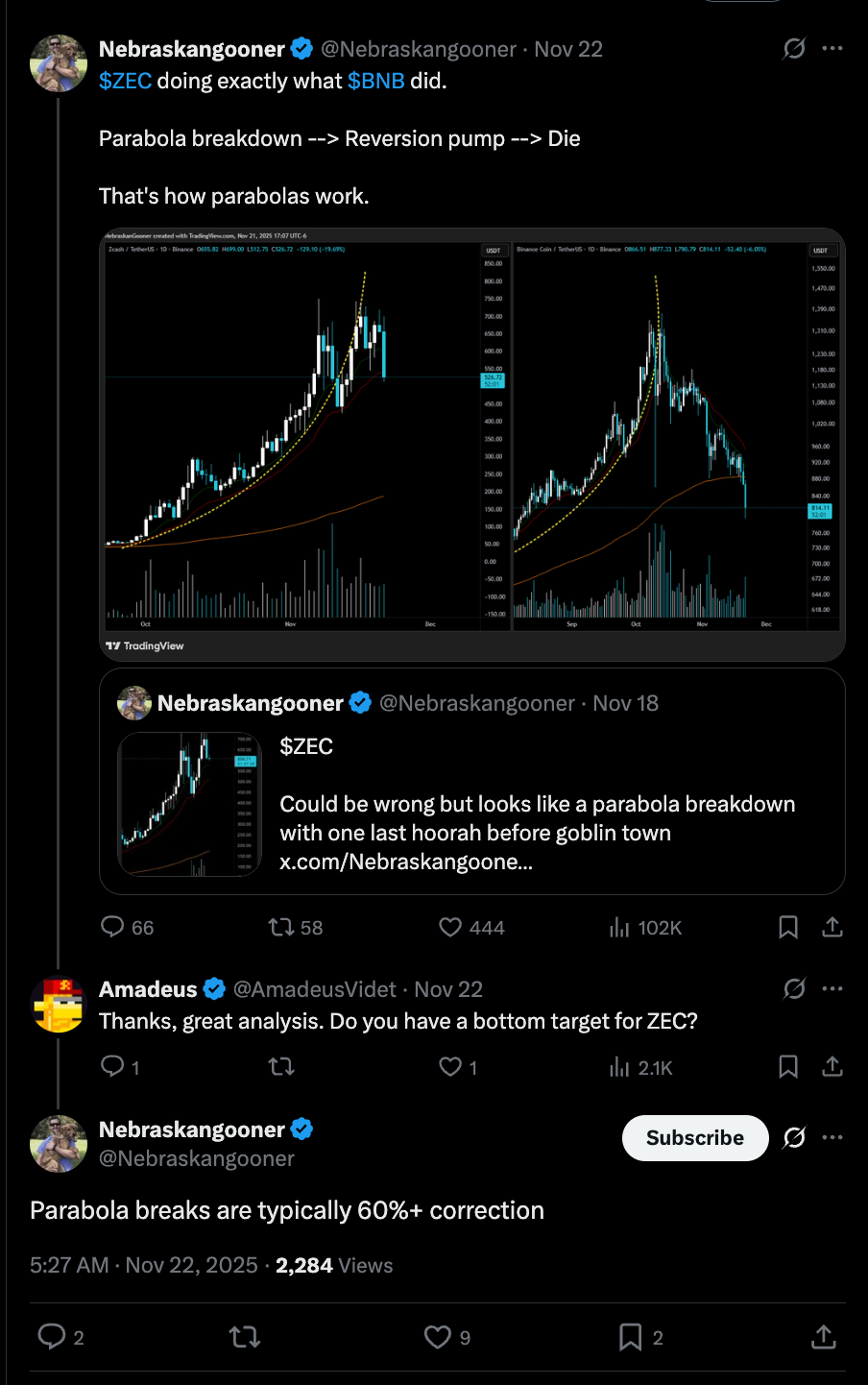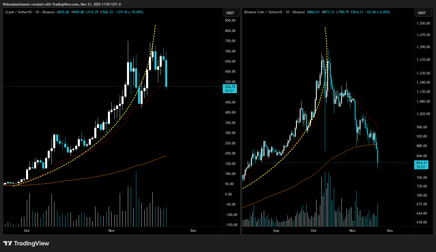Текущая структура Zcash напоминает параболическое движение и развал, наблюдаемый ранее в BNB (BNB) до его резкой коррекции, по мнению трейдера NebraskanGooner.