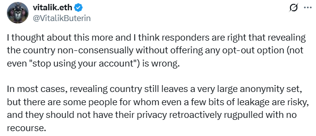 «Я подумал об этом и согласен с тем, что раскрытие страны без согласия и без возможности отказаться — неправильно,» позже добавил Бутерин.