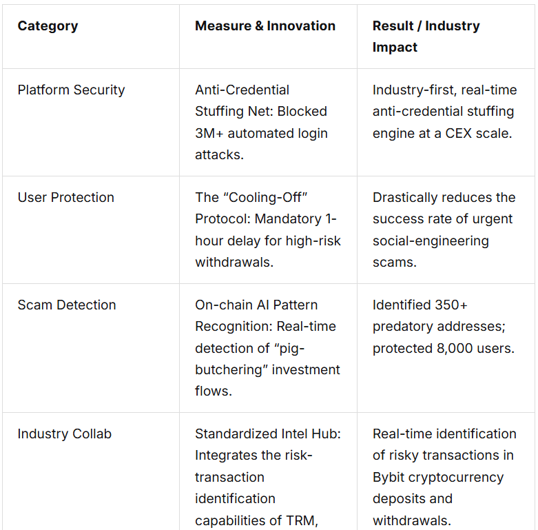 Также Bybit заявила, что в предыдущем квартале система выявила 350 адресов, связанных с высокорисковыми инвестиционными схемами, что помогло уберечь около 8 000 пользователей от потенциальных потерь при выводе. Кроме того, в течение 2025 года платформа, по ее данным, предотвратила более трех миллионов попыток credential stuffing — атак с массовым подбором учетных данных.