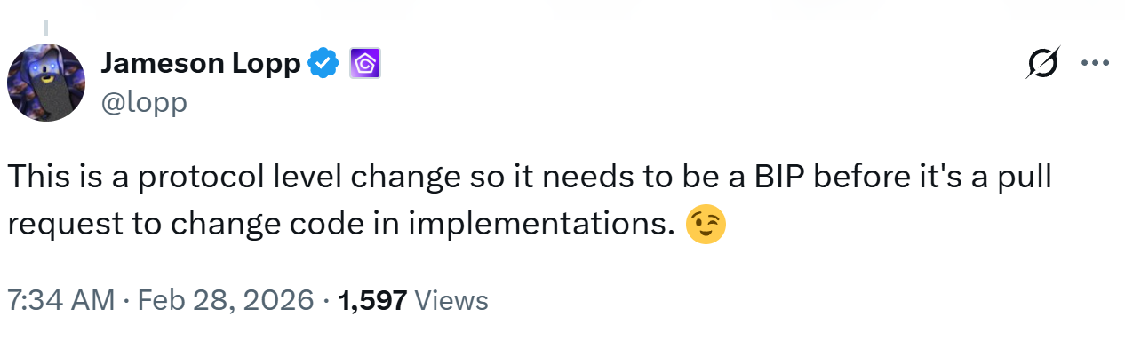 Он отдельно отметил, что речь идет именно о хардфорке: изменение сделает ранее недействительную транзакцию допустимой, а все узлы должны будут обновиться до заданной высоты активации. При этом, по его словам, цель инициативы — не обойти процесс разработки Bitcoin, а запустить обсуждение в сообществе.