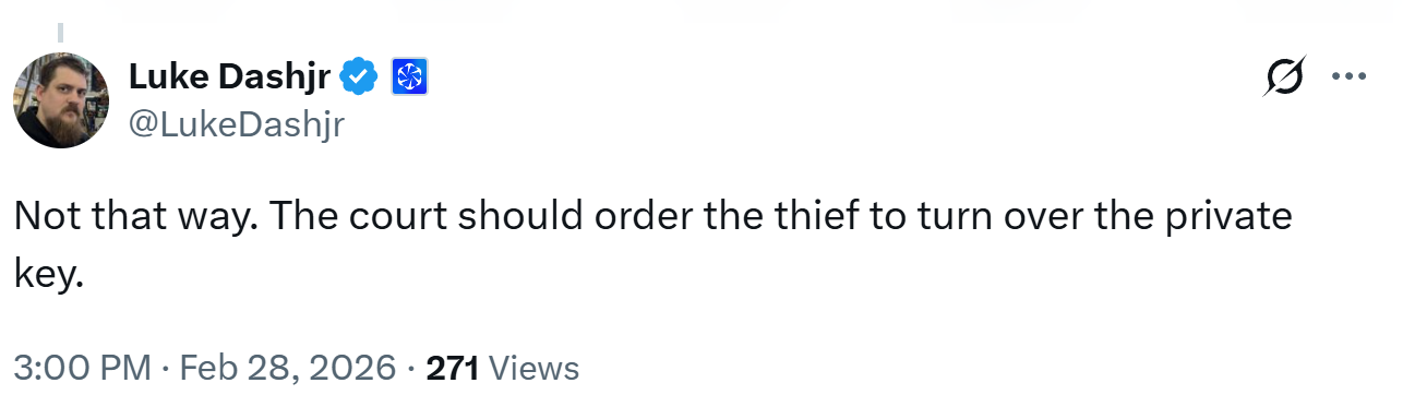 Карпелес утверждает, что управляющий Mt. Gox ранее отказывался инициировать ончейн-восстановление, ссылаясь на неопределенность — будет ли когда-либо принято такое изменение консенсуса. По его мнению, это создает тупиковую ситуацию: управляющий не действует без уверенности, а сообщество не может оценить идею без конкретного предложения, и опубликованный патч должен стать предметом предметной дискуссии.