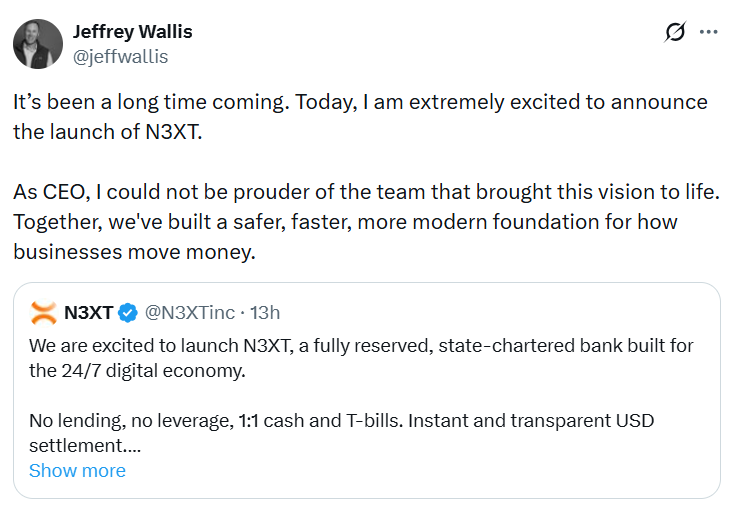 Джеффри Уоллис, бывший директор по цифровым активам и стратегии Web3 в Signature Bank, станет генеральным директором и президентом N3XT и отметил, что инновации в криптовалютной сфере лежат в основе нового проекта.