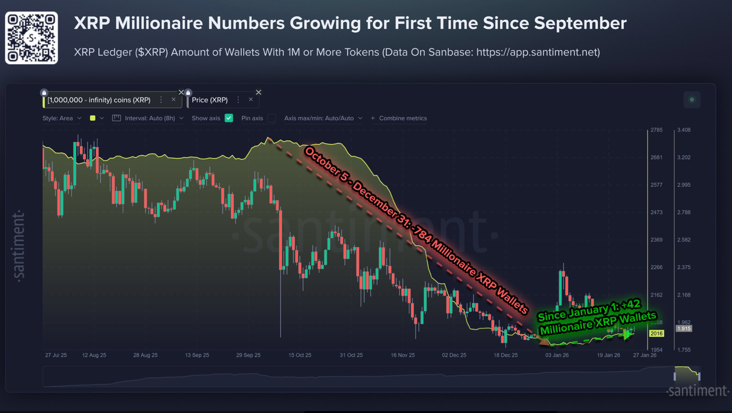 По данным Santiment, цена XRP с начала 2026 года снизилась на 4%, однако число «миллионерских» кошельков начало расти впервые с сентября. С 1 января в реестр вернулись еще 42 кошелька с балансом свыше 1 млн XRP.