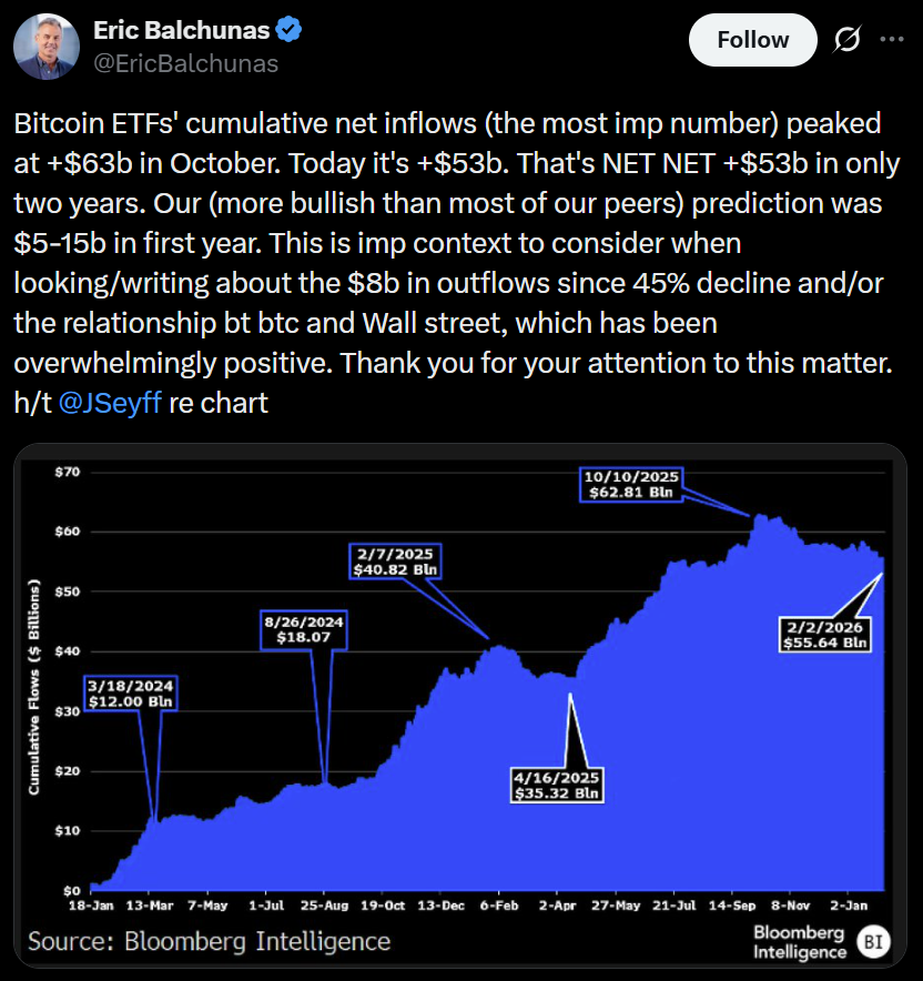 По словам аналитика Bloomberg по ETF Эрика Балчунаса, совокупный чистый приток в Bitcoin-ETF достиг пика около $63 млрд в октябре, а сейчас составляет примерно $53 млрд даже после нескольких месяцев погашений.