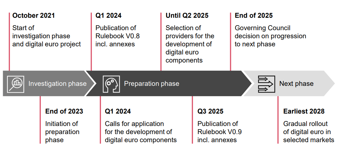 Работа продвигается медленно: исследовательская фаза началась в октябре 2021 года, а в октябре 2025 года совет управляющих ЕЦБ завершил подготовительный этап и решил перейти к подготовке к выпуску.